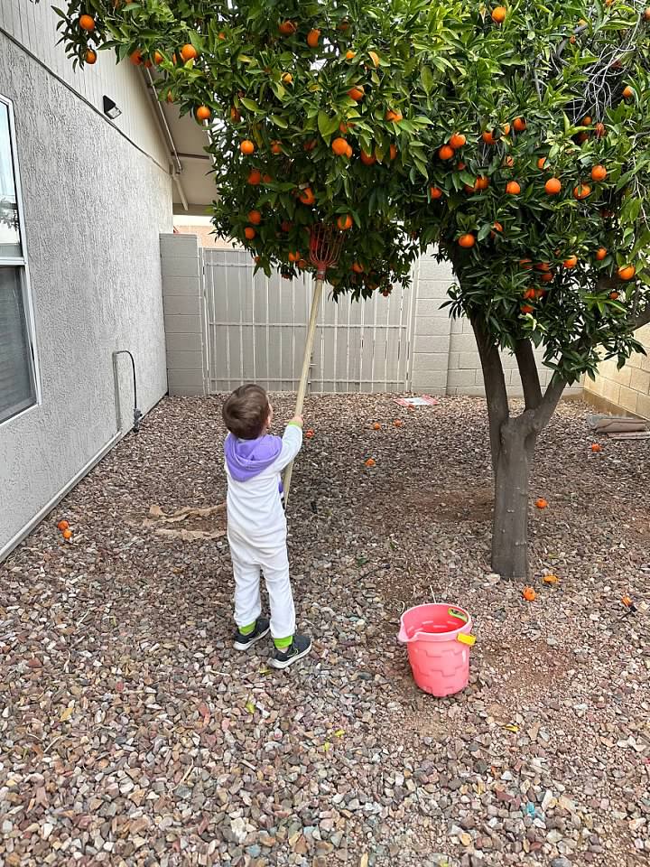 He was really into picking oranges from our tree this year, and then juicing them for us.