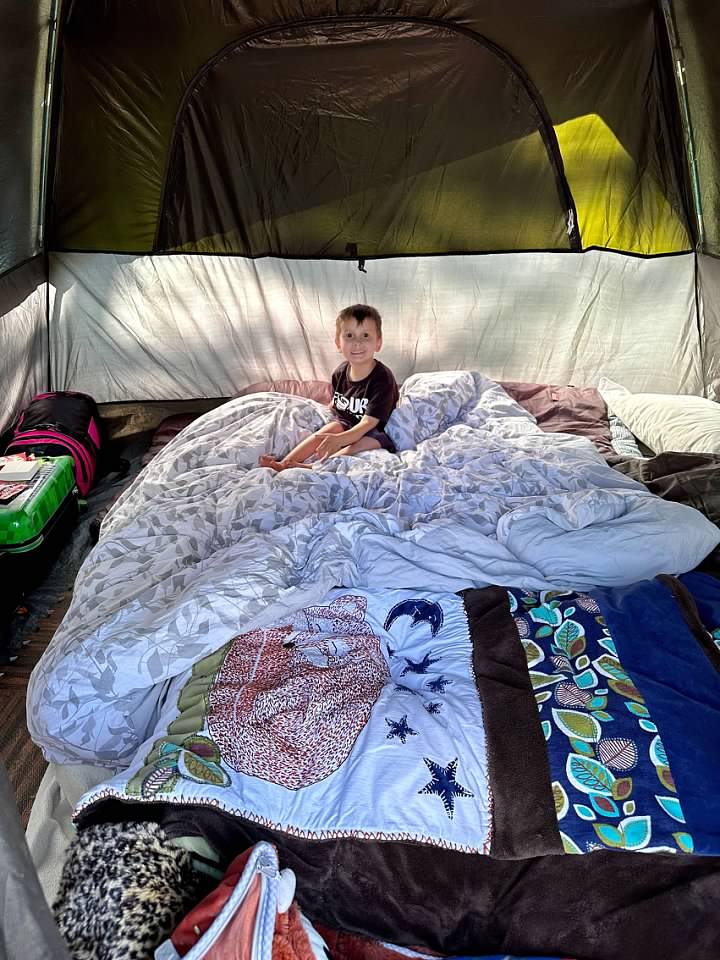 Fox didn't want to go this year. He told me that it would be ok, if it was in a cabin (which there weren't any), but he didn't want to sleep in a tent, and he doesn't like to be outside. Which is SO HIM. I contemplated to leave him at home with Katie, and just take Finn, but after talking to her and some other people about it, I decided that sometimes you just have to suck it up and go have fun, even if it's not your favorite. I brought about 100 blankets and sleeping bags to make it as cozy and comfortable as I could for him, plus the temperatures were dipping into the low 40's at night, so I wanted to be prepared. He ended up admitting, that the tent was pretty cozy.