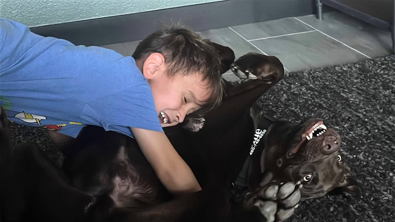 This boy loves his dogs.