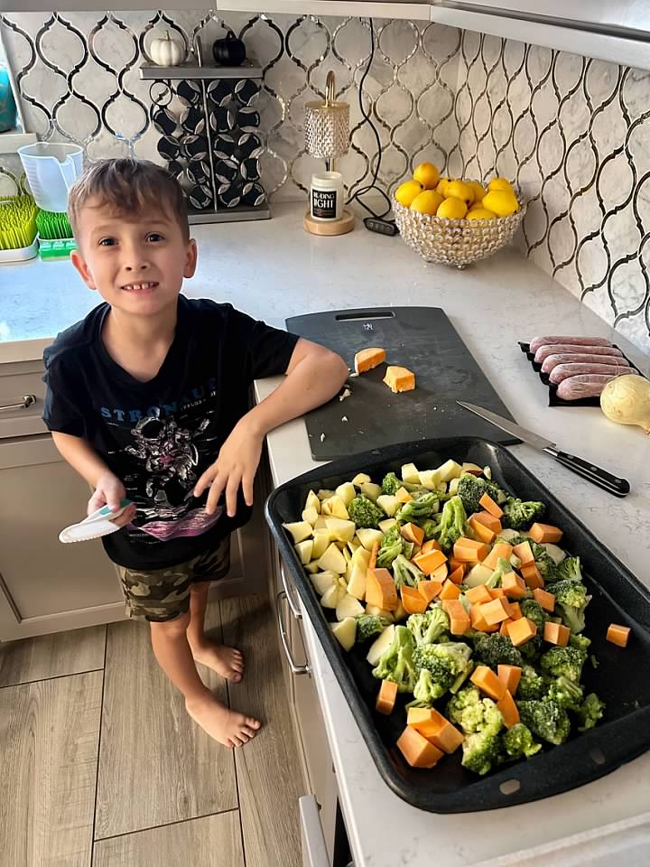 He told me he was bored, so I put him to work helping me with dinner and he loved it.