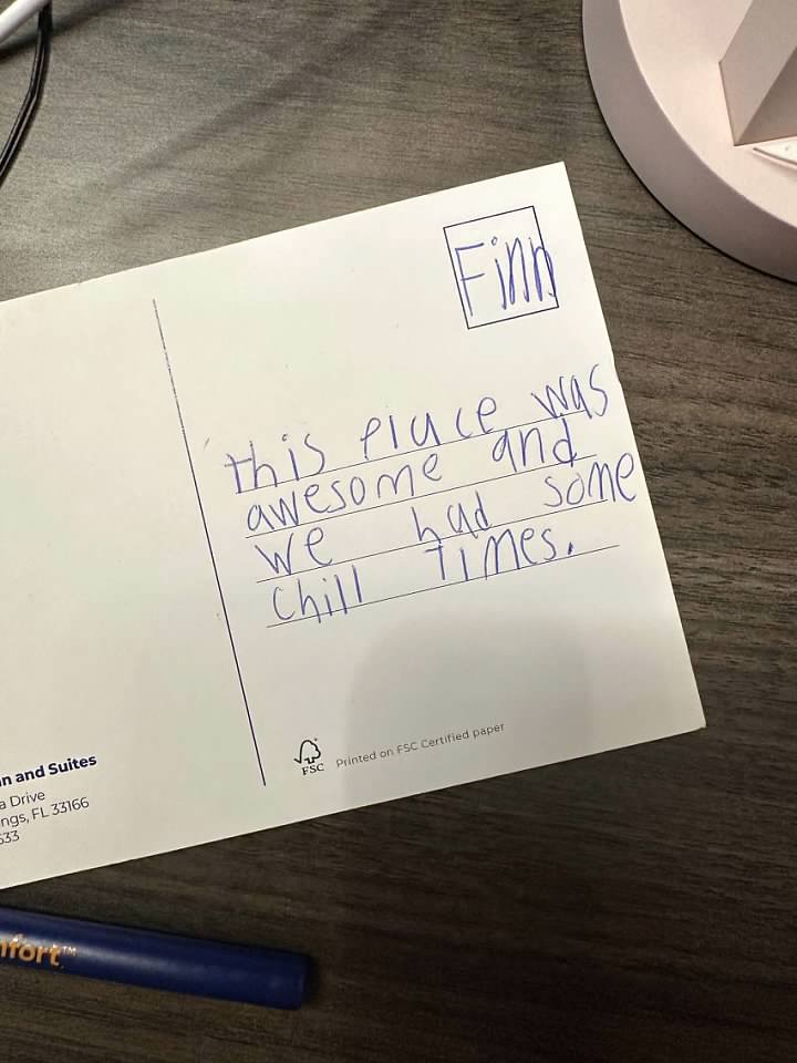 We flew to Miami, and then checked into a hotel for the night before boarding the cruise ship. Finn wrote this little note and left it on my night stand.